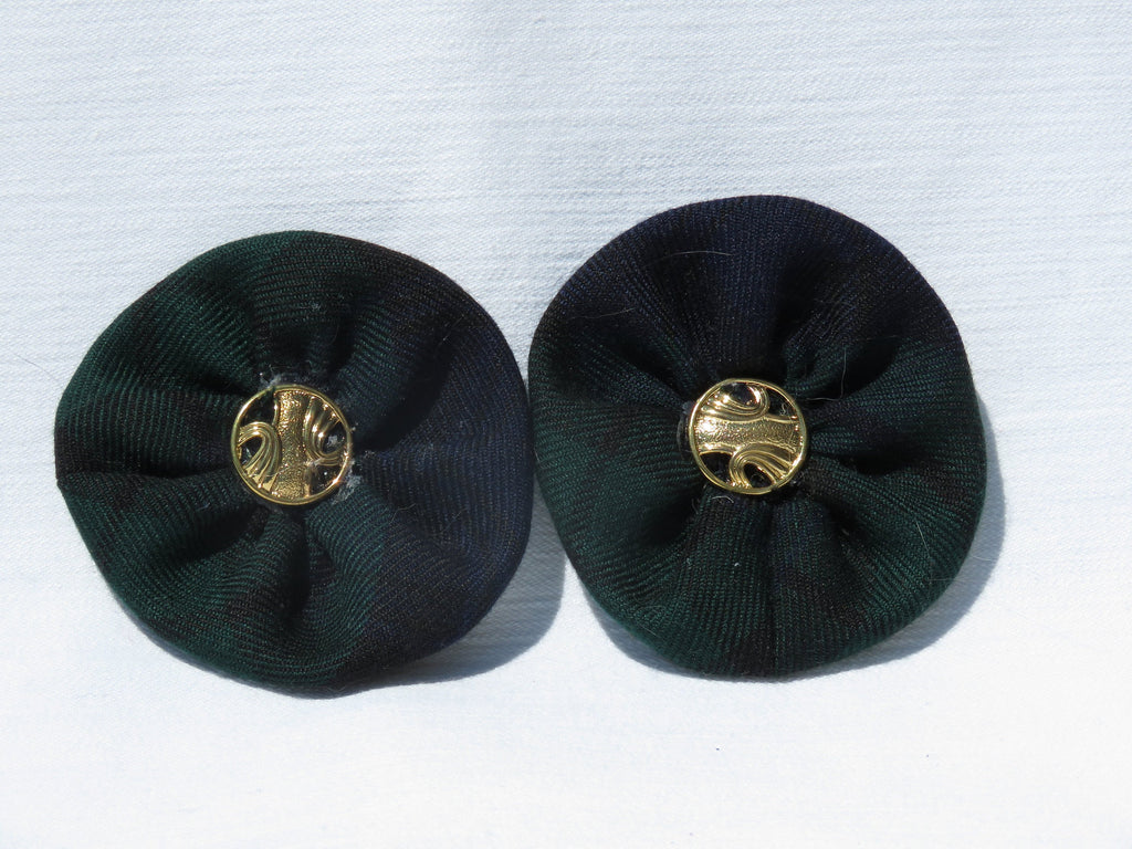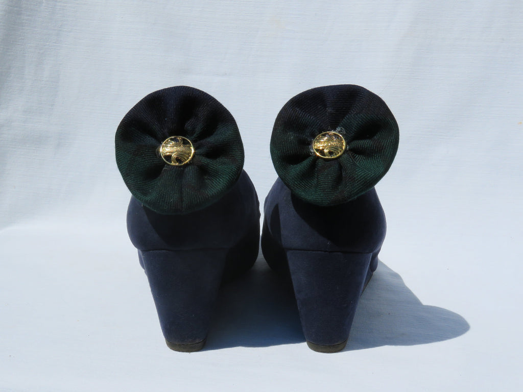 The Black Watch tartan shoe clips will dress up your shoes for that military luncheon you are attending. The plaid shoe flowers can be worn at the toe or the heel of your shoes. Dress up your bridesmaid's shoes at your Black Watch wedding. Although primarily a shoe accessory, they may also be fastened to your lapel or put in your hair.