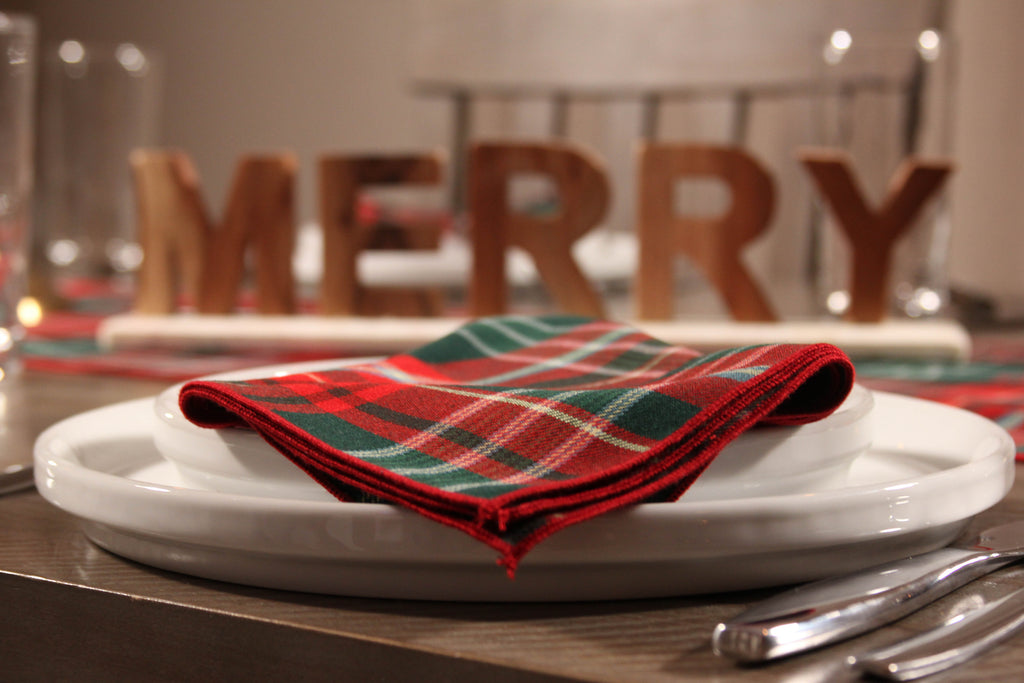 Close-up of a red and green plaid napkin placed on a white plate atop a wooden table.