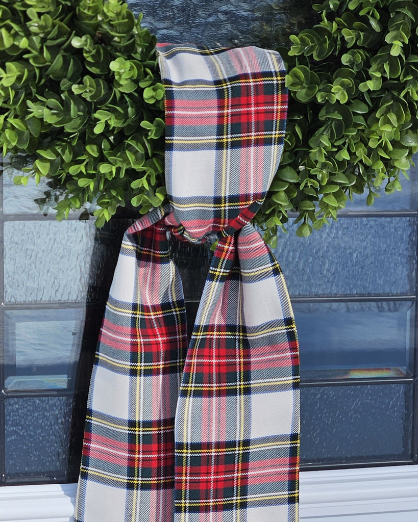 Add a touch of festive elegance to your home with our white and red Dress Stewart Tartan Wreath Sash. This classic tartan, with its soft white background and vibrant red accents, is perfect for dressing up your front door wreath or adding a cozy touch to your indoor Christmas decor. Its timeless design and cheerful colours make it a beautiful way to celebrate the season in style.
